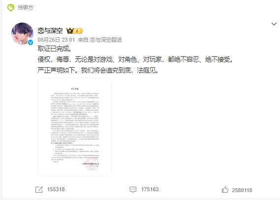 而就在三天前(8月26日),另一款由叠纸互娱开发和运营的女性向3D恋爱手游《恋与深空》也在官方微博深夜发表声明,回应先前说唱歌手派克特“攻击”乙女游戏(以女性群体为目标受众的恋爱模拟类游戏)的歌曲,表示对侵权和侮辱行为“绝不容忍、绝不接受”,并声称“将会追究到底,法庭见”。