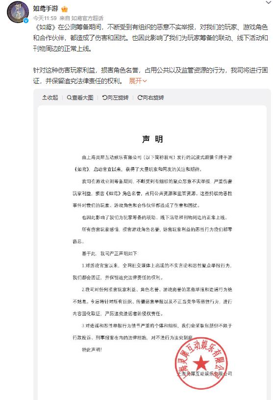 《如鸢》在声明中称,"在公测筹备期间,不断受到有组织的恶意不实举报,对我们的玩家、游戏角色和合作伙伴,都造成了伤害和困扰。也因此影响了我们为玩家筹备的联动、线下活动和刊物周边的正常上线。针对这种伤害玩家利益,损害角色名誉,占用公共以及监管资源的行为,我司将进行固证,并保留追究法律责任的权利。”