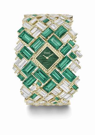 为献礼150周年诞辰,PIAGET伯爵瞩目呈献精妙非凡的高级珠宝系列,其中两枚Essence of Extraleganza奢雅之源系列高级珠宝腕表首次耀目亮相本次高级钟表展。腕表极为罕见地融汇了近40颗长阶梯形切割的哥伦比亚祖母绿,总重达26.11克拉,堪称珠宝镶嵌领域的“皇冠”。全新Essence of Extraleganza奢雅之源高级珠宝系列以金为主角,将珍贵宝石作为迷人点缀,为佩戴作品的绅士淑女诠释出与众不同的自由个性。