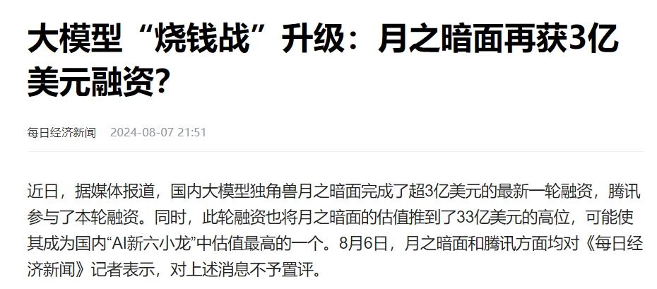 Kimi的商业化仍在初期,营销烧的只能是融资的钱。近日,有媒体报道称月之暗面完成了超3亿美元的最新融资,腾讯参与了本轮融资,月之暗面最新估值也随之推高至33亿美元。
