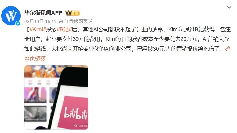 近期有媒体报道称,在五个月左右的投流之后,Kimi在B站给出的CPA(Cost Per Action,用户转化人均成本)报价,高达30元左右,这个价格对多数创业公司来说都是“降维打击”。