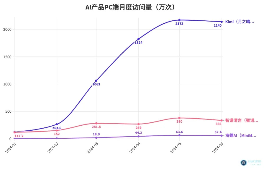 网站分析平台Similarweb的监测数据显示,自今年3月在B站加强推广后,Kimi的访问量增幅一度达到402.9%,并且与智谱清言、海螺AI等产品拉开相当大的差距。