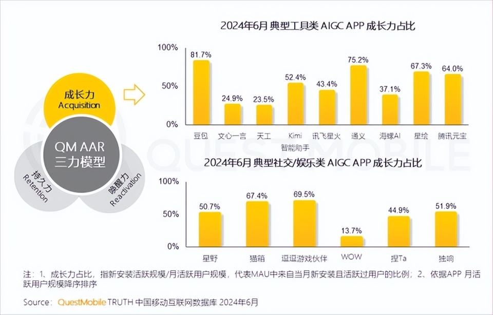 “砸钱”对整个行业的繁荣度肯定是有用的。今年6月的AI应用月活数据表现方面,猫箱、Kimi等在AI应用中增长亮眼,与半年前的“籍籍无名”形成鲜明对比。