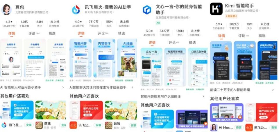 豆包在字节的“加持”下交出了一份不错的答卷。截至8月30日,“趣解商业”搜索发现,在小米应用商店内,豆包、讯飞星火、文心一言、Kimi四款应用的下载次数分别显示为1亿次、7310万次、5427万次、2821万次,kimi的下载次数与其他几款相比差距不小。