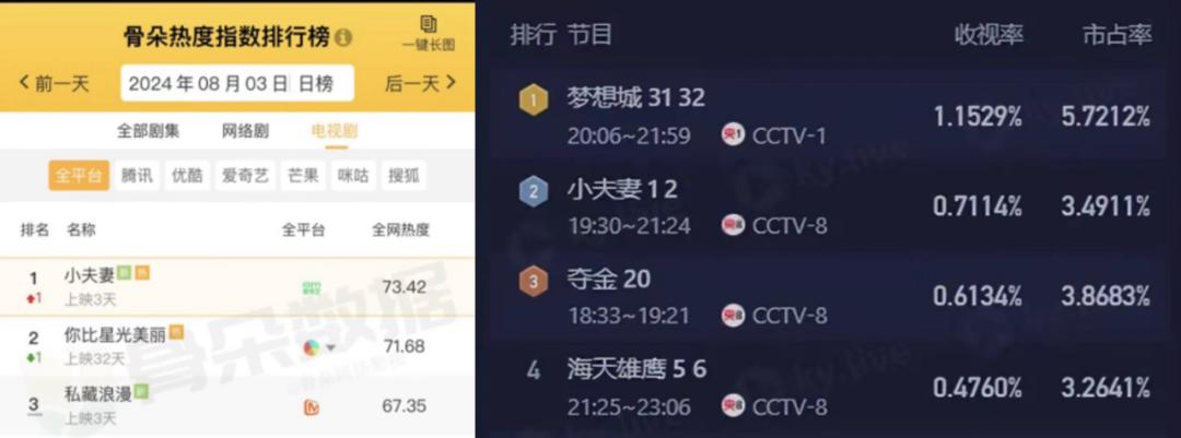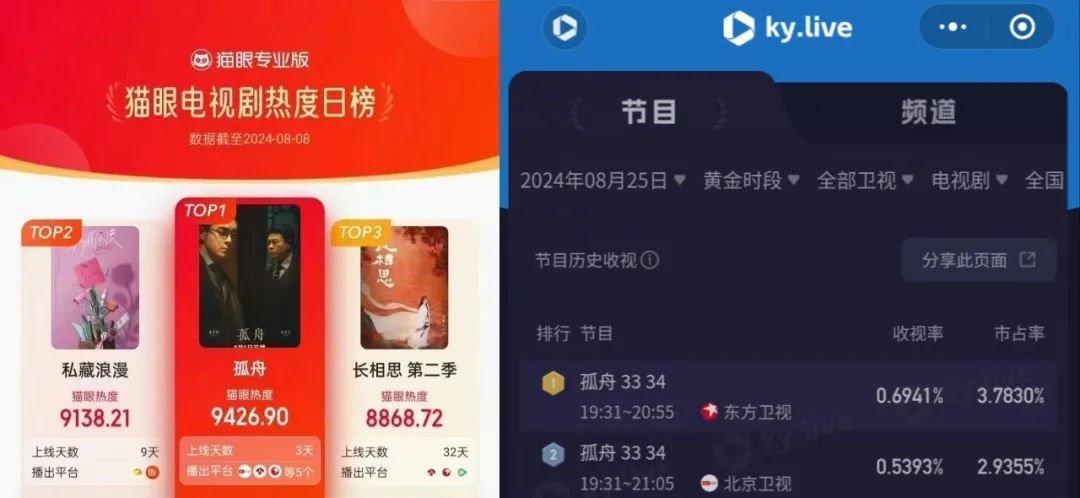 此外kk还关注到一点,除了各平台独播的内容之外,爱奇艺出品的《小夫妻》《孤舟》则都采取了台网同步的排播方式,其中《小夫妻》在央视八套和爱奇艺播出;《孤舟》在爱奇艺和优酷同步播出的同时,成为“多星联播”的受惠者,在东方卫视、北京卫视和江苏卫视播出。从播出数据可以看出,这两部剧充分发挥出了家庭和谍战题材广泛的群众基础,观众足够喜爱的内容,在台网两端都能取得不错的成绩。