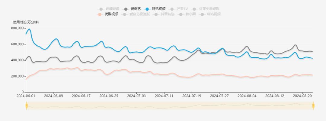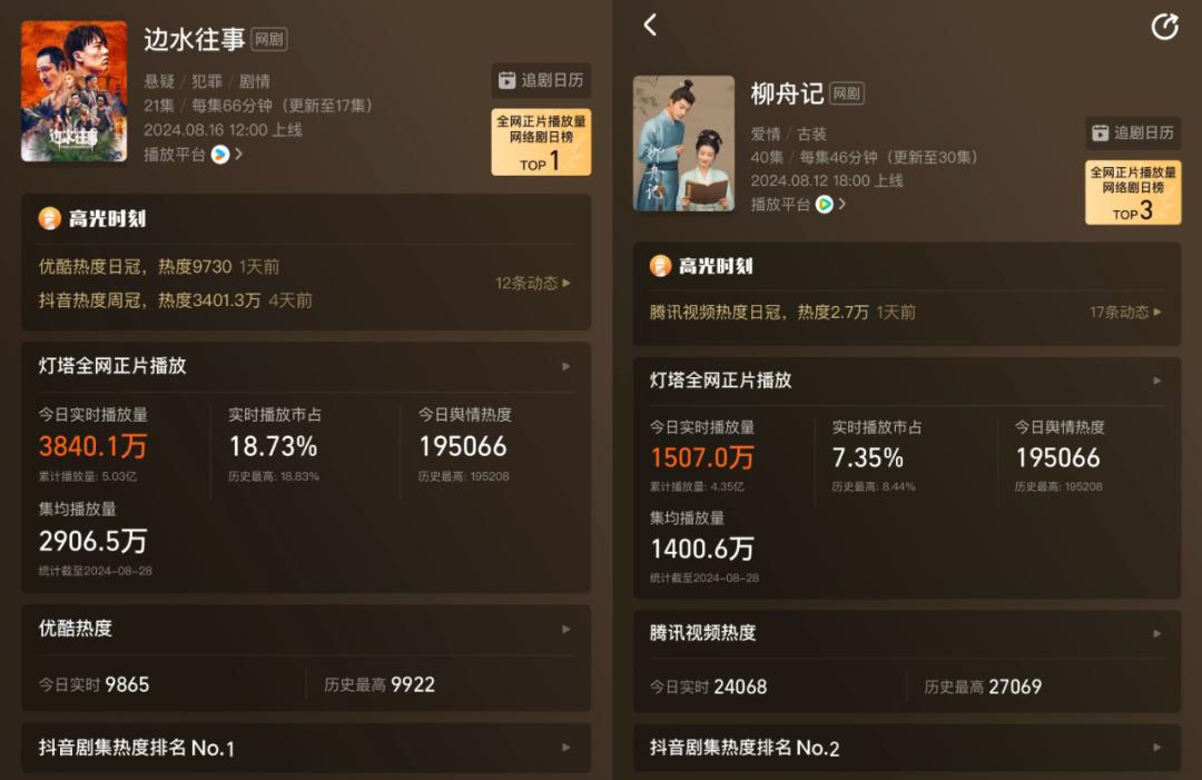 相应地,平台也会针对自己擅长的优势题材进行独播,形成垂类影响力。目前进入尾声的《边水往事》作为悬疑题材中的创新类型在优酷独播,成为灯塔正片播放量的新晋榜首。目前站内日活和使用时长方面与此前表现基本持平,维持在近4000万的水位线。而在暑期档坚持深耕古装和爱情赛道的腾讯,尾盘推出的《柳舟记》似乎还是差了一口气,未能有效拉起流量,平台走势继续震荡下行。