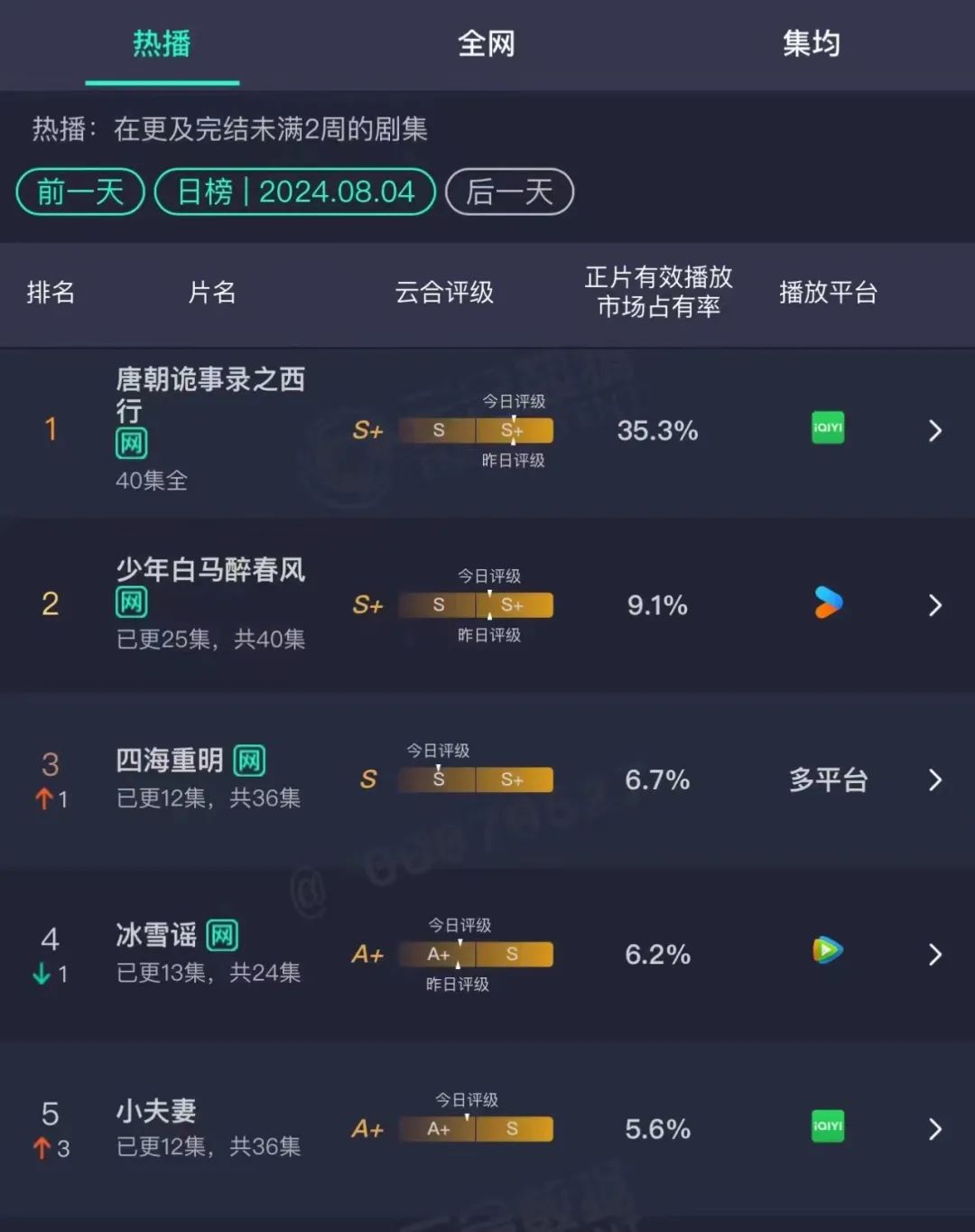 7月中下旬到8月初,为期三周的奥运周期震荡剧集市场,时差挡不住受众热情,赛事分流注意力经济。事实证明,真正的强者从不抱怨环境,暑期档的真·剧王《唐朝诡事录之西行》恰出现在此周期,甚至创下6次热度破万的“逆跌”奇迹。