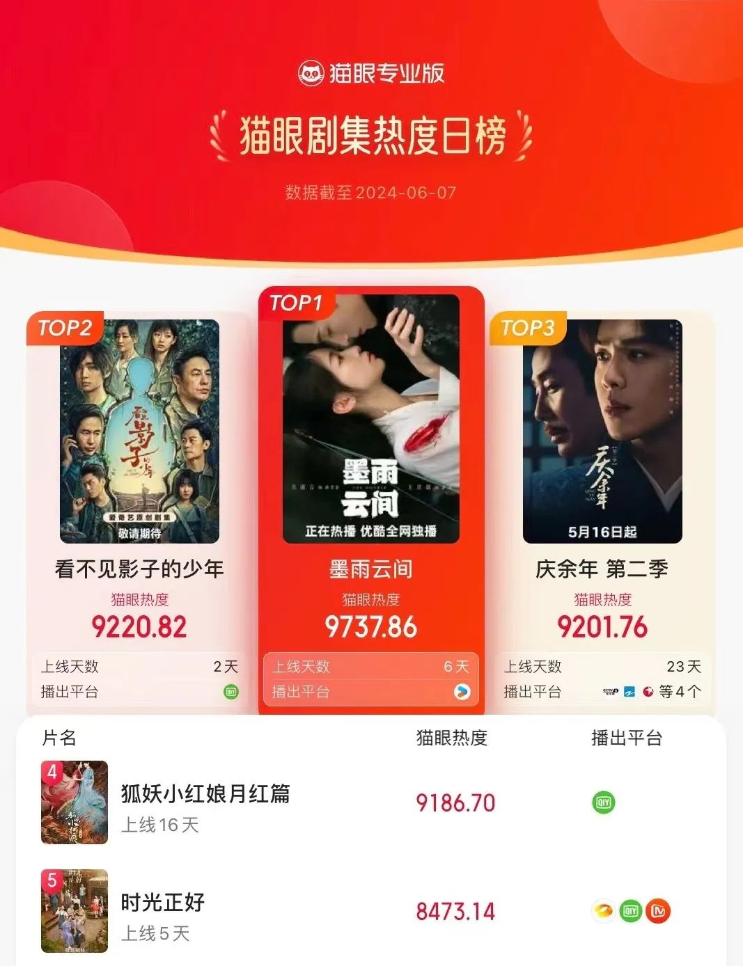 优酷在6月初推出的《墨雨云间》在上线第4天实现对剧集市场的横扫,根据灯塔数据显示,6月5日该剧正片播放量破亿,市占率29.37%。《墨雨云间》的黑马之姿整体挑高了观众对暑期档的热度预期。腾讯紧随其后推出的《玫瑰的故事》,刘亦菲+亦舒+1v4的爱情和薛芳菲一骑绝尘的爽感正面对打,前者直到6月25日会员收官,才在灯塔的正片播放排行中以微弱优势领先《墨雨云间》,居于首位。