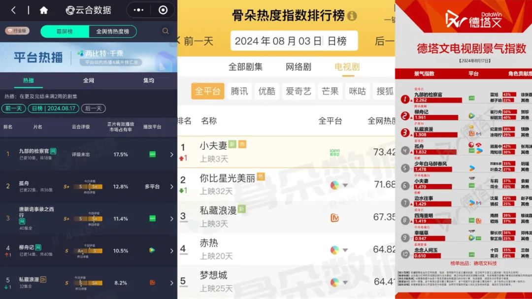 以未检犯罪题材剧《九部的检察官》为例。该剧刷新了爱奇艺站内20集内短剧热度值,在播期间几乎席卷猫眼、灯塔、德塔文、Vlinkage、云合、骨朵等全部数据榜单首位,有效承接了《唐诡西行》的热度,进一步拉高爱奇艺日活和使用时长的水位,两条曲线均位于平台之首。8月23日新上的古装喜剧《四方馆》则再度以差异化类型勾起受众兴趣,被观众评为“渐入佳境,越看越有”,这也让爱奇艺用户使用时长仍在持续走高。
