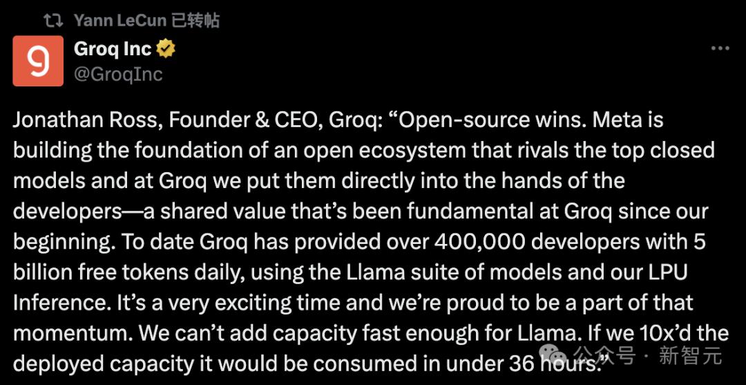 「到目前为止,Groq已经使用Llama模型套件和自家LPU Inference,每天向40多万开发人员提供50亿个免费token」。