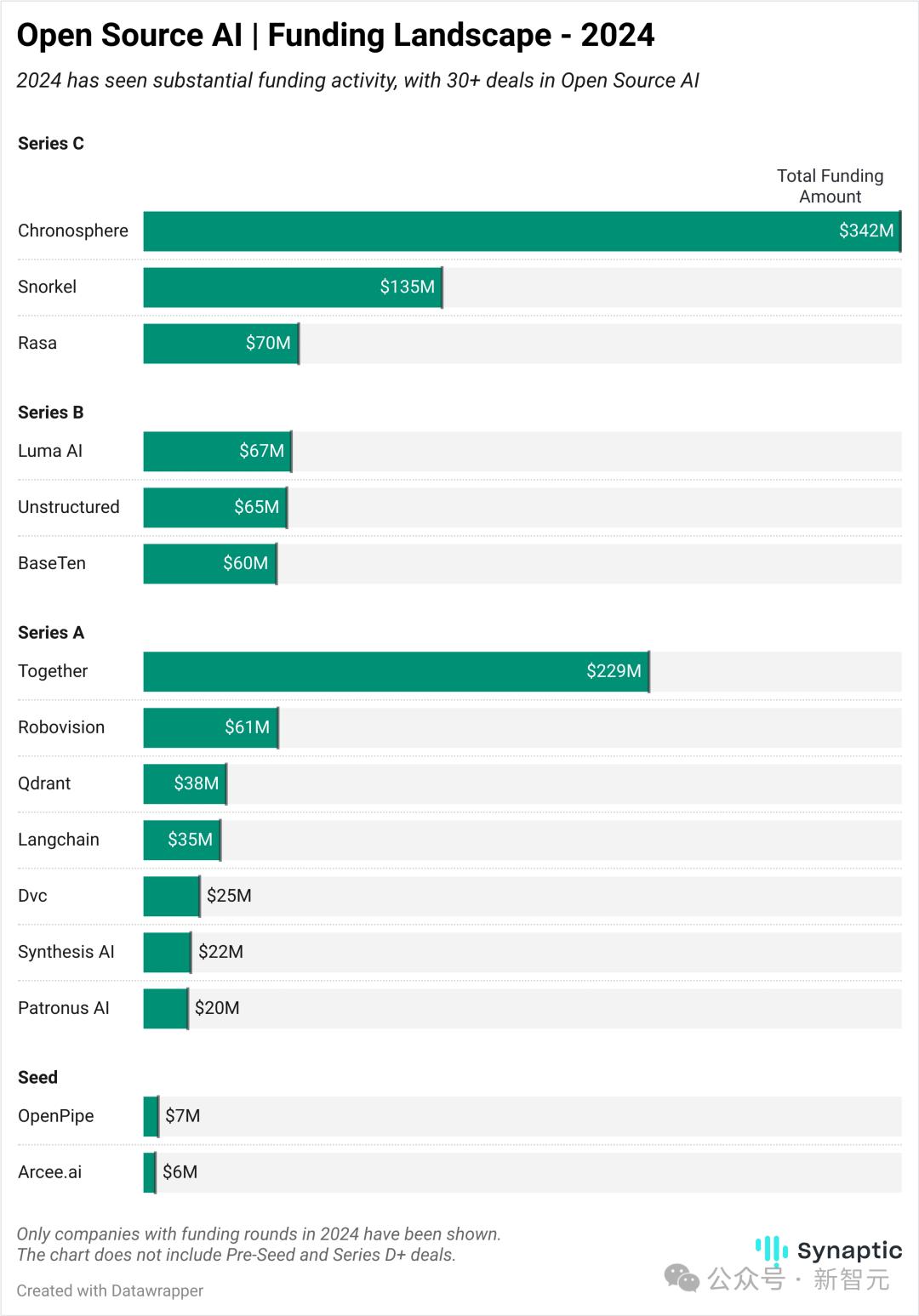 过去两年,开源AI领域已完成60多笔交易,总融资额超过130亿美元。这些交易中有超过45%属于A轮及以上的融资,表明对增长阶段投资的强烈关注。