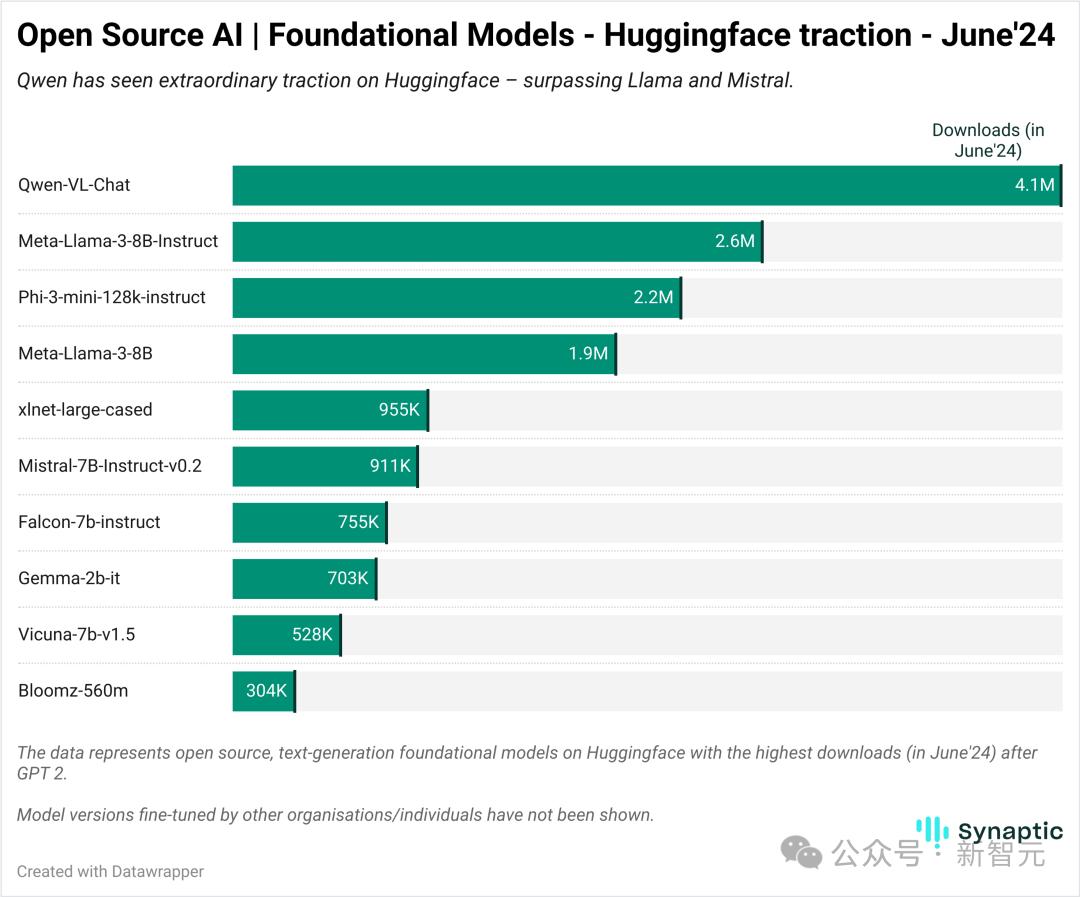 经过大量数据预训练的Qwen,于2024年6月在Huggingface Traction上获得了最高的下载量。