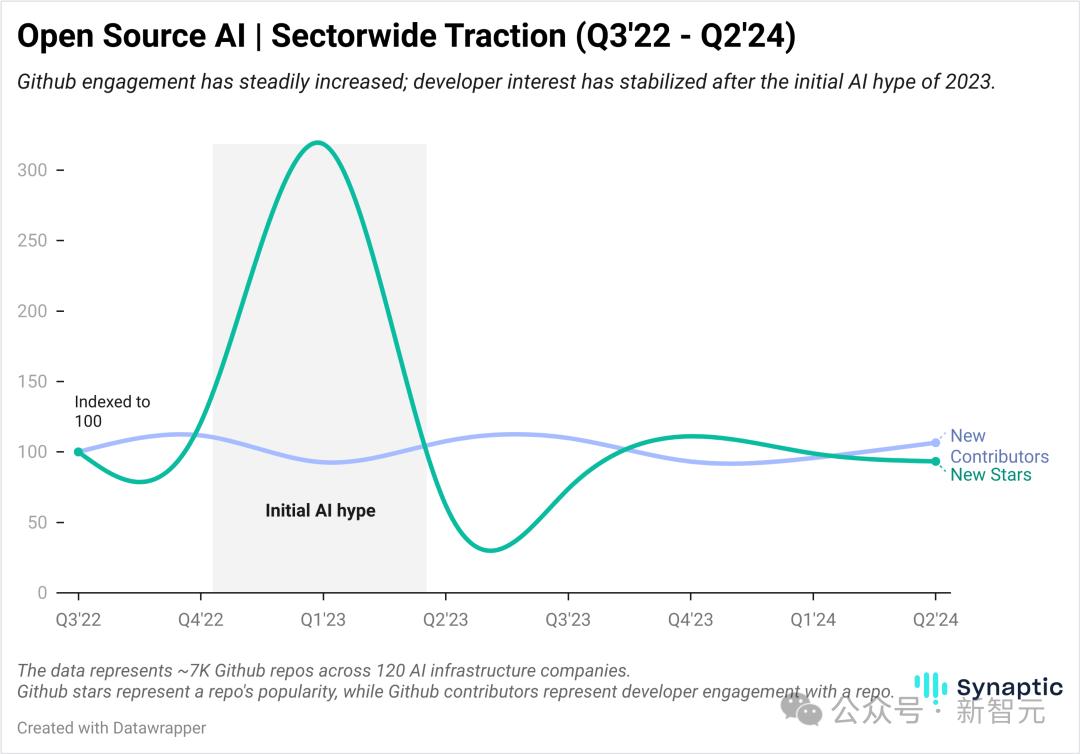 2024年,开源AI中严肃的开发者参与(即GitHub贡献者)仍在继续增加。