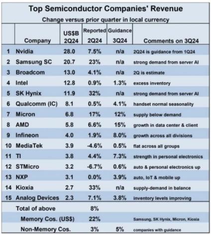 值得注意的是,在排名前十五的公司中,只有两家公司(联发科和ST)在 2024 年第二季度的收入出现下滑。增长最强劲的是内存公司,SK海力士和铠侠分别上涨超过 30%,三星半导体上涨 23%,美光科技上涨 17%。