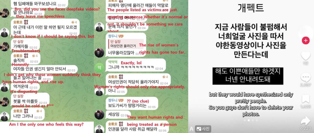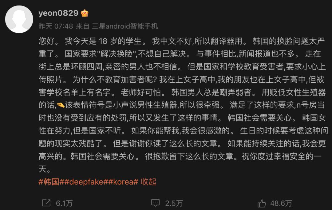 有些韩男对这件事的态度也是较为恶劣,甚至有初中男生开公开写到“不用担心,你不够漂亮,不至于被Deepfake”这种话。