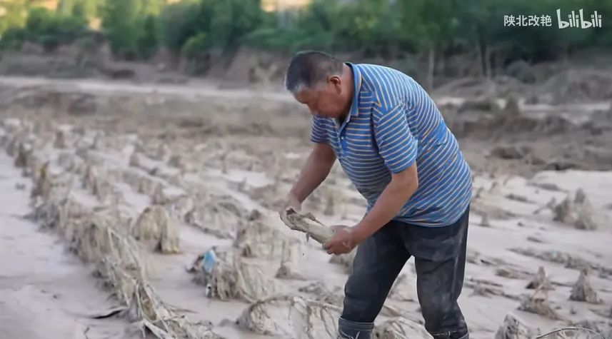 7月中下旬的陕北洪涝中,农民的玉米地被淹。(图/B站@陕北改艳)