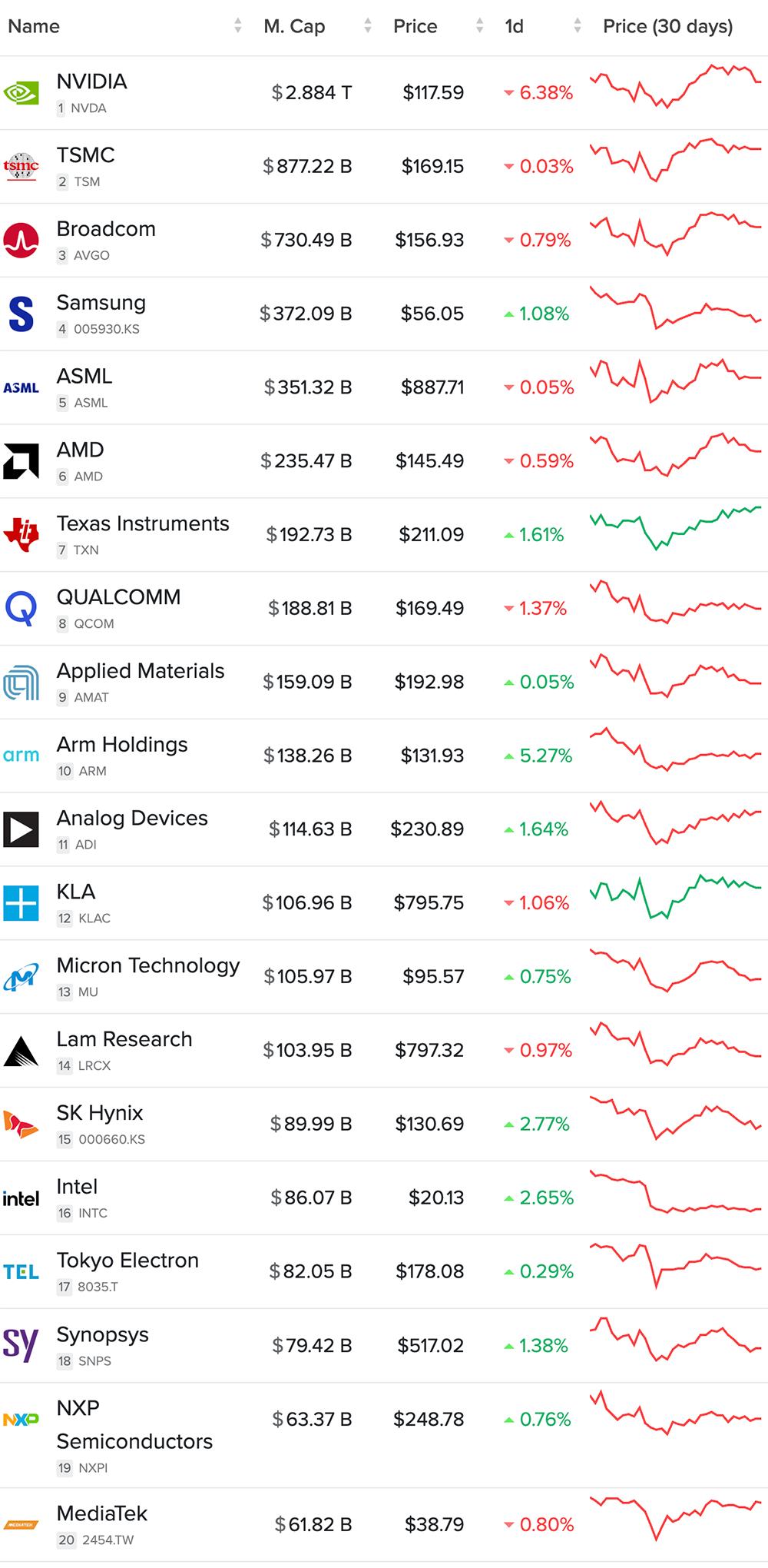 截至8月30日,全球半导体企业市值TOP20,其中英特尔排名第16(图源:CompaniesMarketCap)