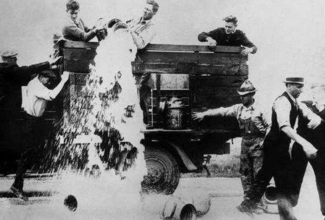 1934年1月,在美国伊利诺伊州芝加哥,上千奶农封锁了公路,通过“拦路倒奶”,倾倒了超过10万磅其他奶农的牛奶,随后,加利福尼亚州、威斯康星州、爱荷华州也相继跟上,这就是历史上著名的“倒牛奶事件”。