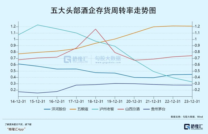 第一,存货及存货周转率。 2023年,泸州老窖存货为116.22亿元(今年一季度继续上升至118.27亿元),而疫情之前数年内均保持在30亿左右,从2020年开始大幅增长,可见渠道动销明显放缓,积压了不少货在酒厂里面。