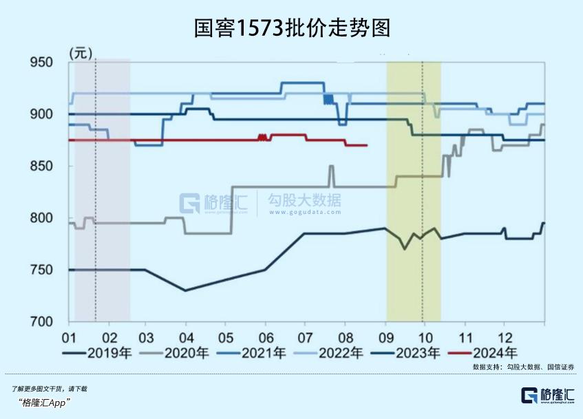 但到底有多少,无法知晓。不过,可以从批价来大致推测供需状况。目前,国窖1573批价为870元,比过去3年均要低不少,也足以证明渠道库存足够大。