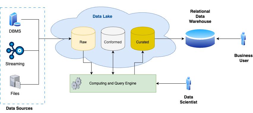 在这种现代架构中,数据湖有效地取代了数据仓库的传统暂存区以及经典的ETL流程。数据湖充当数据提取的中央枢纽,处理大规模数据转换,包括数据协调和数据产品的物化。然后,面向业务的数据集被发布到关系数据仓库中,通常以维度模型构建,以支持报告和商业智能(BI)功能。同时,数据湖可用于机器学习(ML)模型训练并支持高级分析。