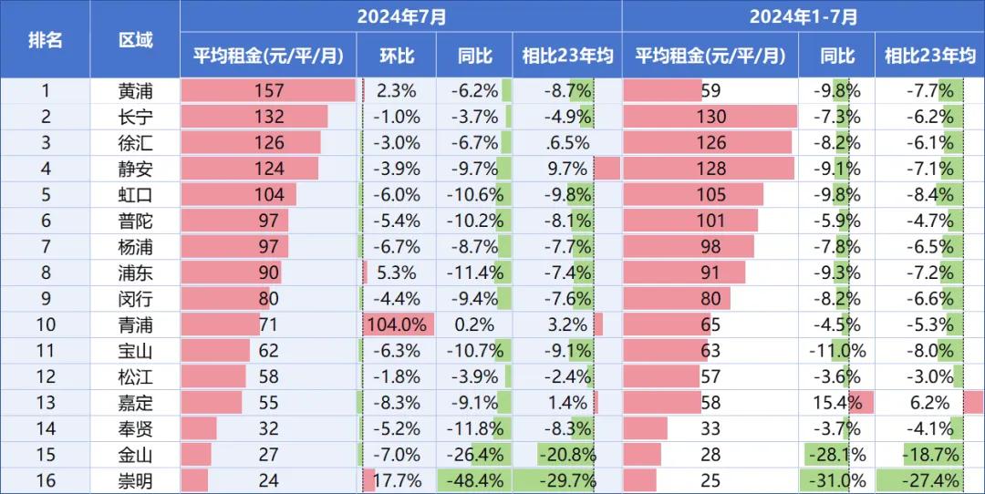 分板块来看,2024年1~7月平均租金,除了嘉定的租金是同比上涨以外,其他行政区都是跌的。