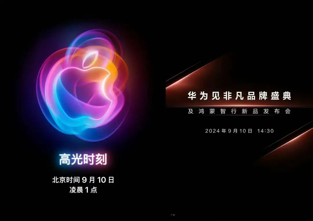9 月 10 日凌晨 1 点,苹果将发布最新一代 iPhone 16——而就在 13 个小时后,大洋彼岸的中国深圳,华为将举行「见非凡品牌盛典及鸿蒙智行新品发布会」。