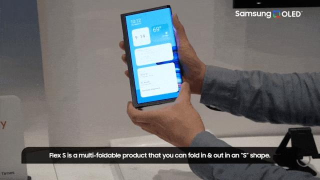 这款名为三星 Flex S 的三折叠原型机,就采用了「S」字折叠的方式,手机的外屏是折叠屏的一部分,展开之后,折叠藏在内侧的另外两块屏幕和外屏共同组成了一块超大屏: