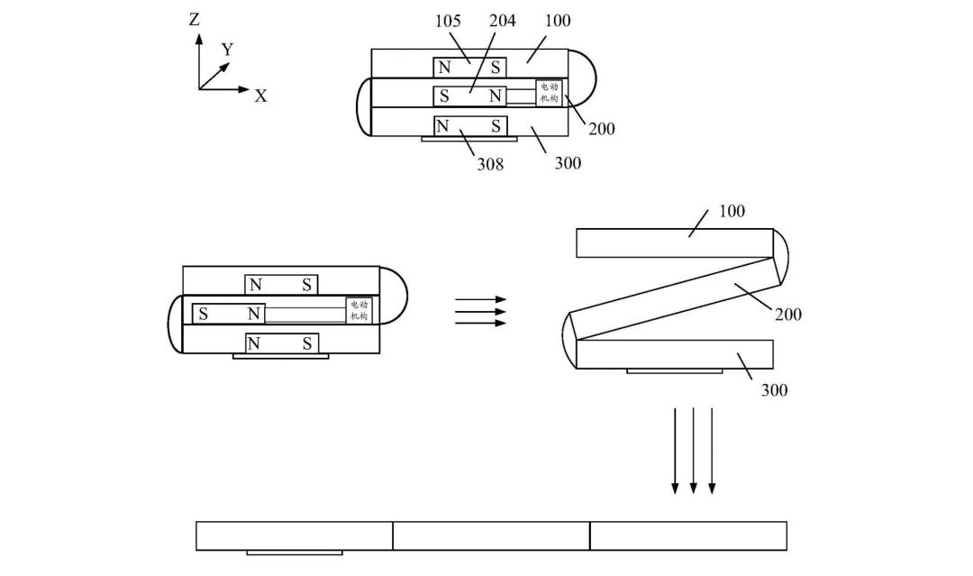 专利说明书还提到了通过一个开关自动展开折叠屏的操作方式,这主要利用了壳体中的磁性部件之间的相互作用实现。显然,多加一块屏幕意味着每次展开/闭合都要多一步操作,而利用磁吸的助力或许是个不错的选择。