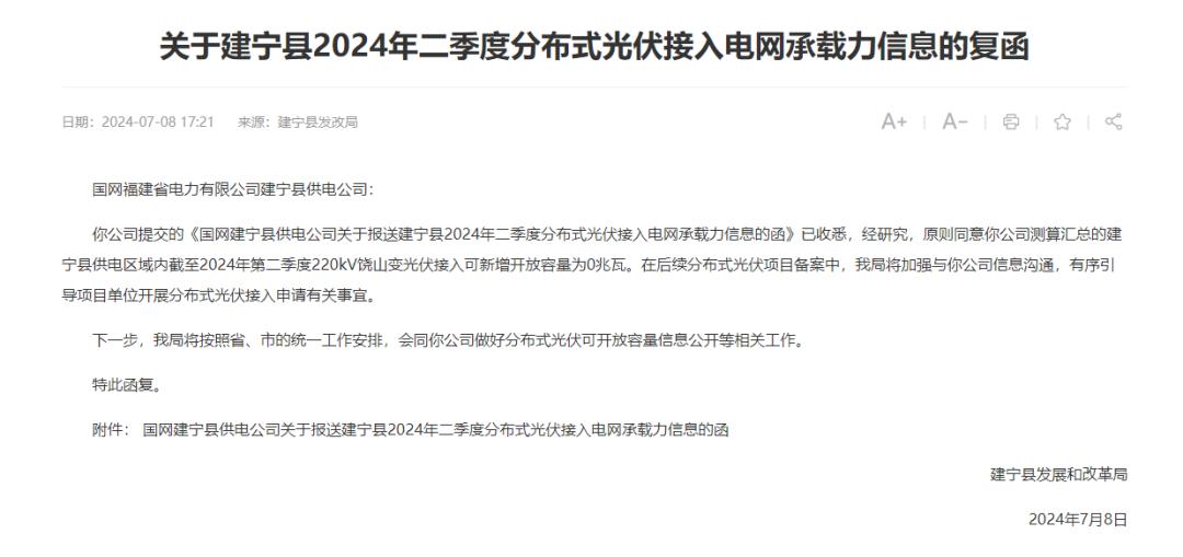 截至2024年第二季度,福建省建宁县分布式光伏可新增开放容量0兆瓦