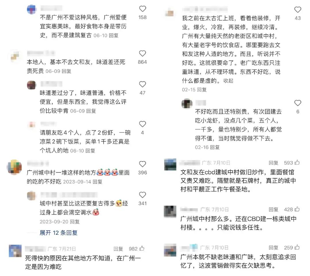 尽管如此,也没有打消网友们的质疑。广州文和友开业初期,每天门庭若市,甚至需要排队3小时以上。但随后出现了明显的水土不服,人气急转直下,排队等候的人数大幅减少。此后,广州文和友不断调整方向,入驻的商户变更不断,但都没有挽留住客群。