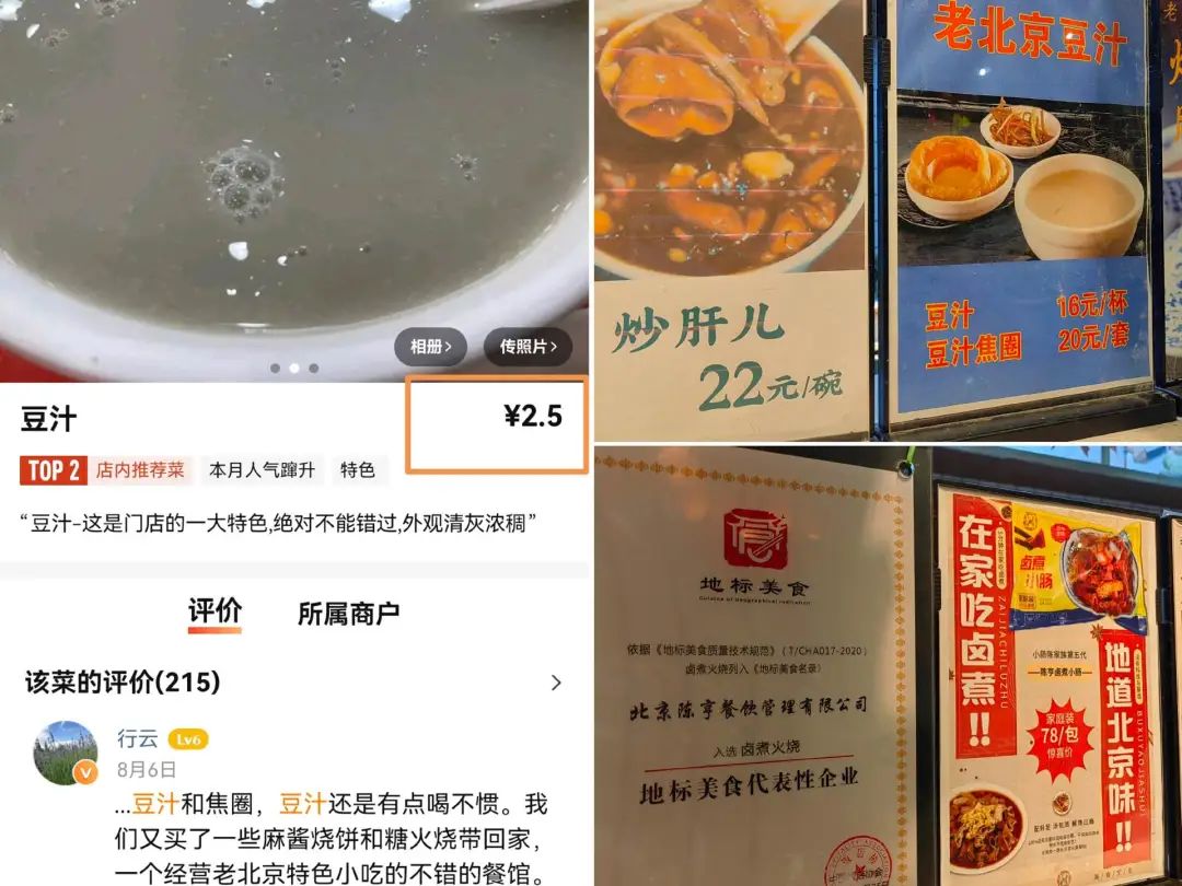 ◎左:某老北京特色饭馆豆汁价格 右:和平菓局菜单及地标证书,豆汁16一碗 摄图:内参君