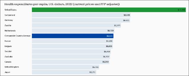2022年,美国人均医疗支出12,555美元,即便在高收入国家中,美国的人均医疗保健支出也远远高于其他国家