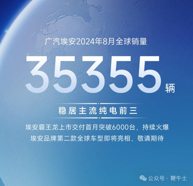 8月份的全球销量达到了35355辆,环比几乎无增长,但稳固了其在主流纯电动汽车品牌中的前三位置,但同比下滑32.08%,这是埃安连续6个月单月同比负增长。