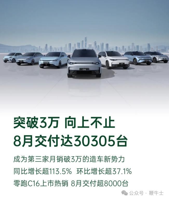 零跑成为了8月份新能源车企里的最大黑马。8月交付达30305台,连创历史新高,同比增长超113%,环比增长超37%。