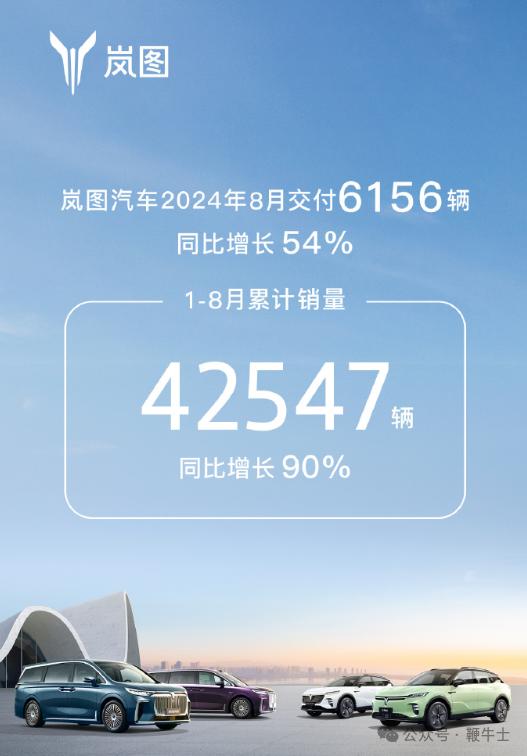 8月份共交付6156辆,同比增长54%;1-8月累计销量42547辆,同比增长90%。