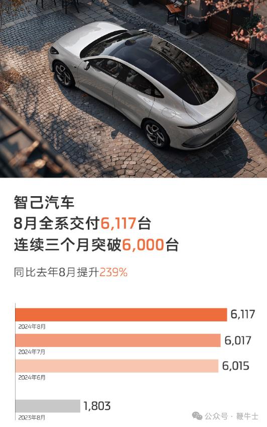 智己8月交付6117台,同比增长239%。尽管官方的表述为连续3个月突破6000台,但实则几乎在原地踏步,没有明显的突破,也属于是中规中矩一派。