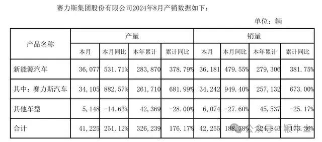 赛力斯公告,8月新能源汽车销量36181辆,同比增长479.55%。其中,赛力斯汽车销量34242辆,同比增长949.40%。