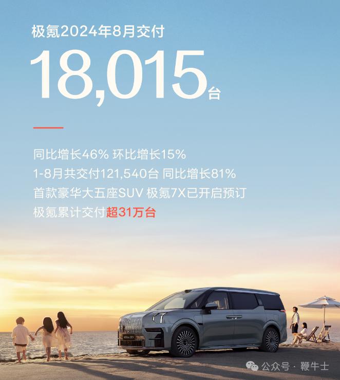 8月交付18015辆,同比增长46%,环比增长15%;1-8月共交付121540辆,同比增长81%。截止8月31日,极氪累计交付31万辆。