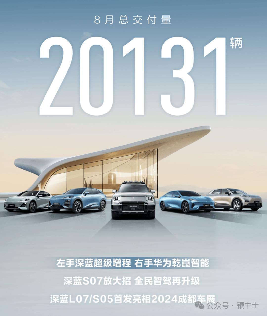 深蓝汽车单月销量创新高,并迈入「两万台俱乐部」,其8月销售新车20131台,环比增长20.4%,同比提升37%。