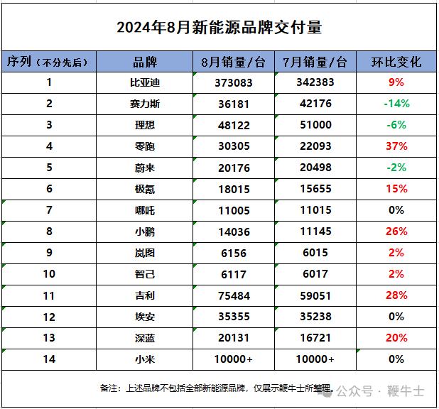 9月2日消息,截止目前,新能源车企8月份销量数据基本公布完毕,为方便查阅,鞭牛士将已发布的数据制作成表,并与7月的数据进行对比。