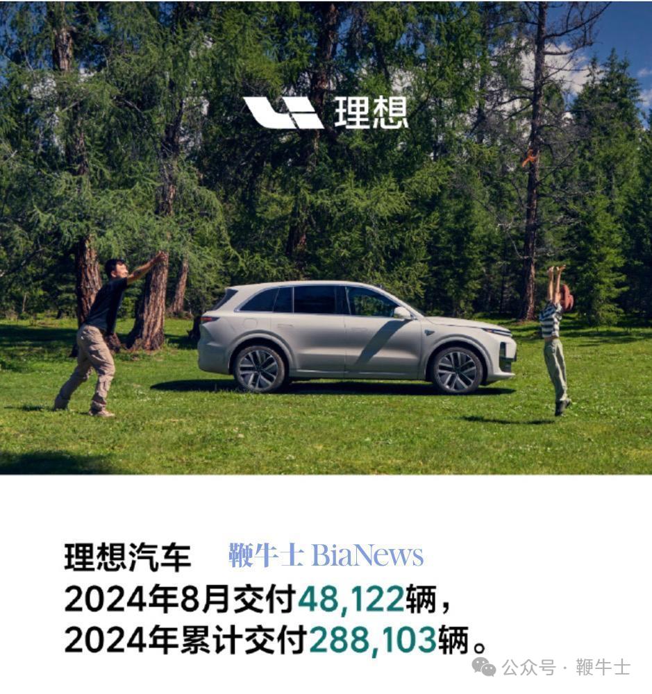 理想汽车8月交付量48122辆,同比增长37.8%;1月至8月共计交付288103辆。