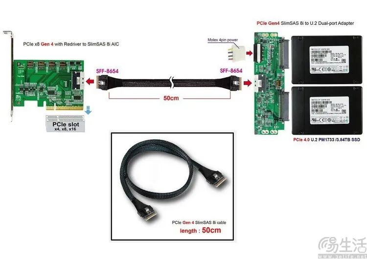 SlimSAS是什么?简单来说,这是一种通常用于企业级SSD的紧凑型接口标准。在绝大多数服务器主板上,它最常见的“规格”是SlimSAS 8X,也就是一个接口可以提供PCIE*8的带宽。当然在实际使用中,绝大多数的企业级SSD使用的只是*4带宽的接口,所以SlimSAS接口很多时候并不直接用来连接SSD,而是通过转接线转出两个U2接口来插两块企业级SSD。说白了,这就是一种用小尺寸接口提供高带宽,变相将接口体积“转嫁”到连接线上、从而节约主板空间的设计而已。