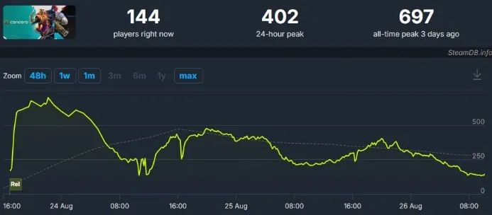 在英雄射击品类的细分赛道上,《Deadlock》的热度暂时领先于网易即将推出的新作《漫威争锋》,后者在最近一轮测试期间的CCU峰值约为5.26万。如果与索尼互动娱乐近期发售的买断制英雄射击游戏《Concord》进行比较,《Deadlock》更拥有碾压式的优势。在Steam商店,《Concord》的最高同时在线玩家数甚至不足700。
