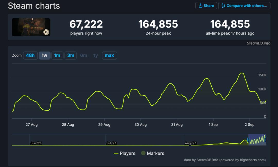 《Deadlock》是V社时隔近5年对外曝光的首款新游戏,借鉴了《守望先锋》、《军团要塞2》和《Dota 2》等畅销大作的玩法元素。有趣的是,V社公布《Deadlock》的方式相当特别:先邀请一批玩家、媒体记者和主播参与测试,直到上上周末才正式官宣,并上线了游戏的Steam页面。目前,《Deadlock》在Steam商店的同时在线玩家数(CCU)已经达到164855。随着更多玩家上手试玩,这个数字预计将会继续增长。