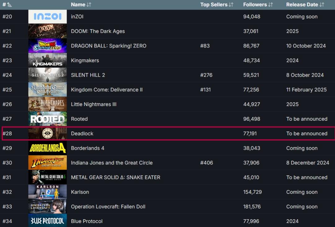 以下是被Steam玩家加入愿望单次数最多的前10款游戏。