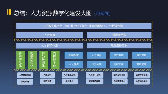 数字化建设大图是可延展的,如果想要在数字化建设上针对自己的工作场景做一些延展,可以利用这张图不断挖掘出自身企业的数字化场景和分析产品,前提是人力资源从业人员和管理者拥有足够强大、不断迭代的数字化思维和能力。