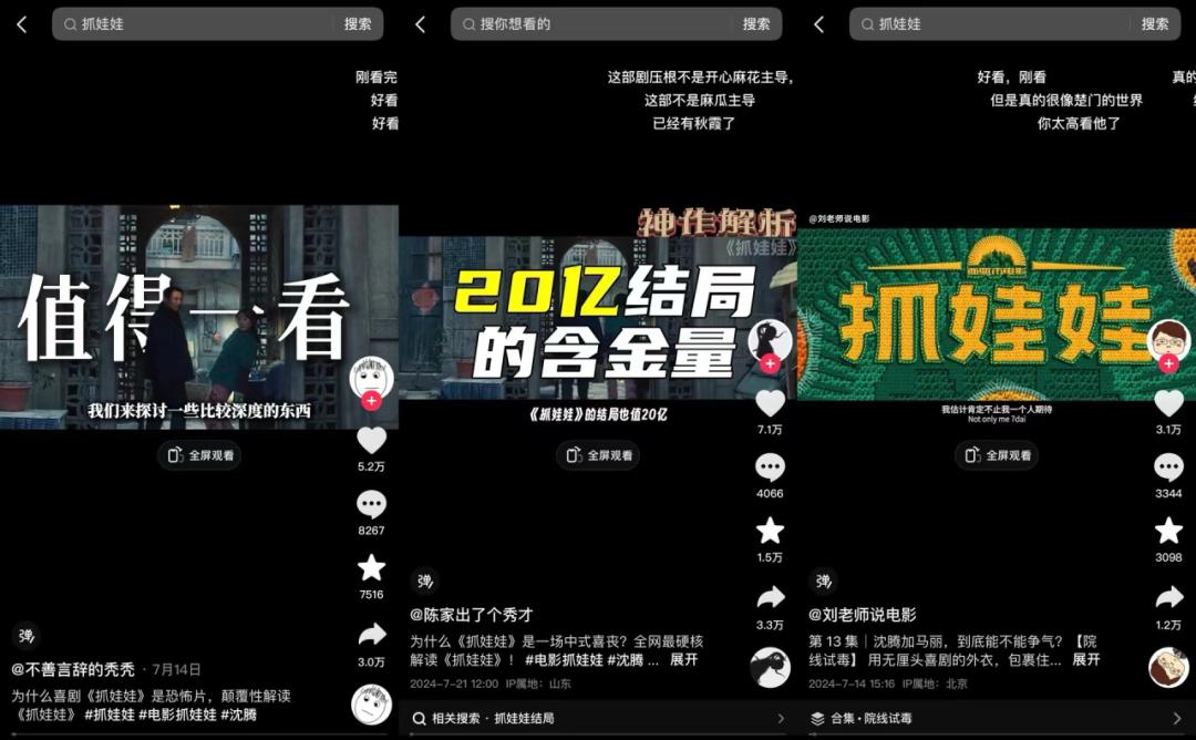 以电影《抓娃娃》为例,电影《抓娃娃》前后一周,「刘老手说电影」「陈家出了个秀才」「不善言辞的秃秃」等一批抖音影视解说类账号都从「中式教育」解读这部电影寻找共情。