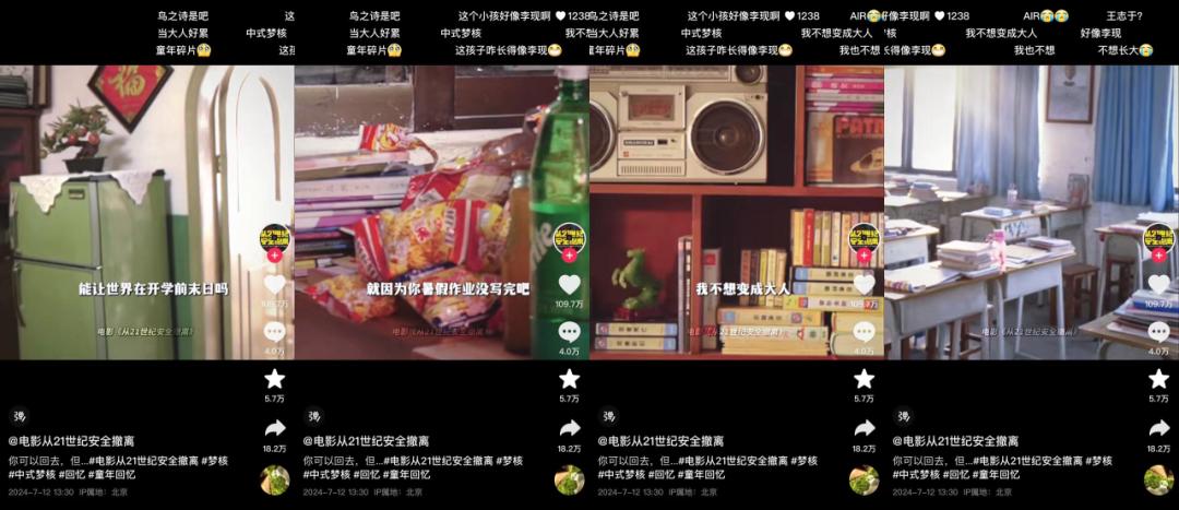 而契合了电影本身强烈的风格化表达,《从21世纪安全撤离》官抖的短视频则结合了故障艺术、千禧复古审美等更多美学风格。官抖的视频中,小猪存钱罐、咪咪虾条、收音机、黑白电视、风铃等童年元素用梦核的方式呈现,「这种宣传视频才能吸引我,而不是什么老戏骨。」这条评论获得了26万的点赞。