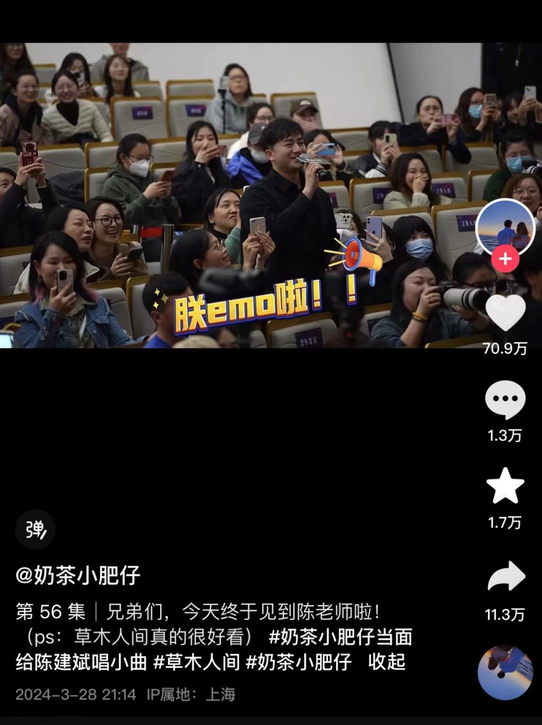 在电影《默杀》的路演现场,抖音达人@胡阿坤 就上台跟主演张钧甯重演电影中的片段,并跟官抖发布共创视频。此前反传销电影《草木人间》的路演中,靠模仿《甄嬛传》中皇上的声音唱歌走红的博主「奶茶小肥仔」,也在路演中当着陈建斌的面唱起了「朕emo啦」。
